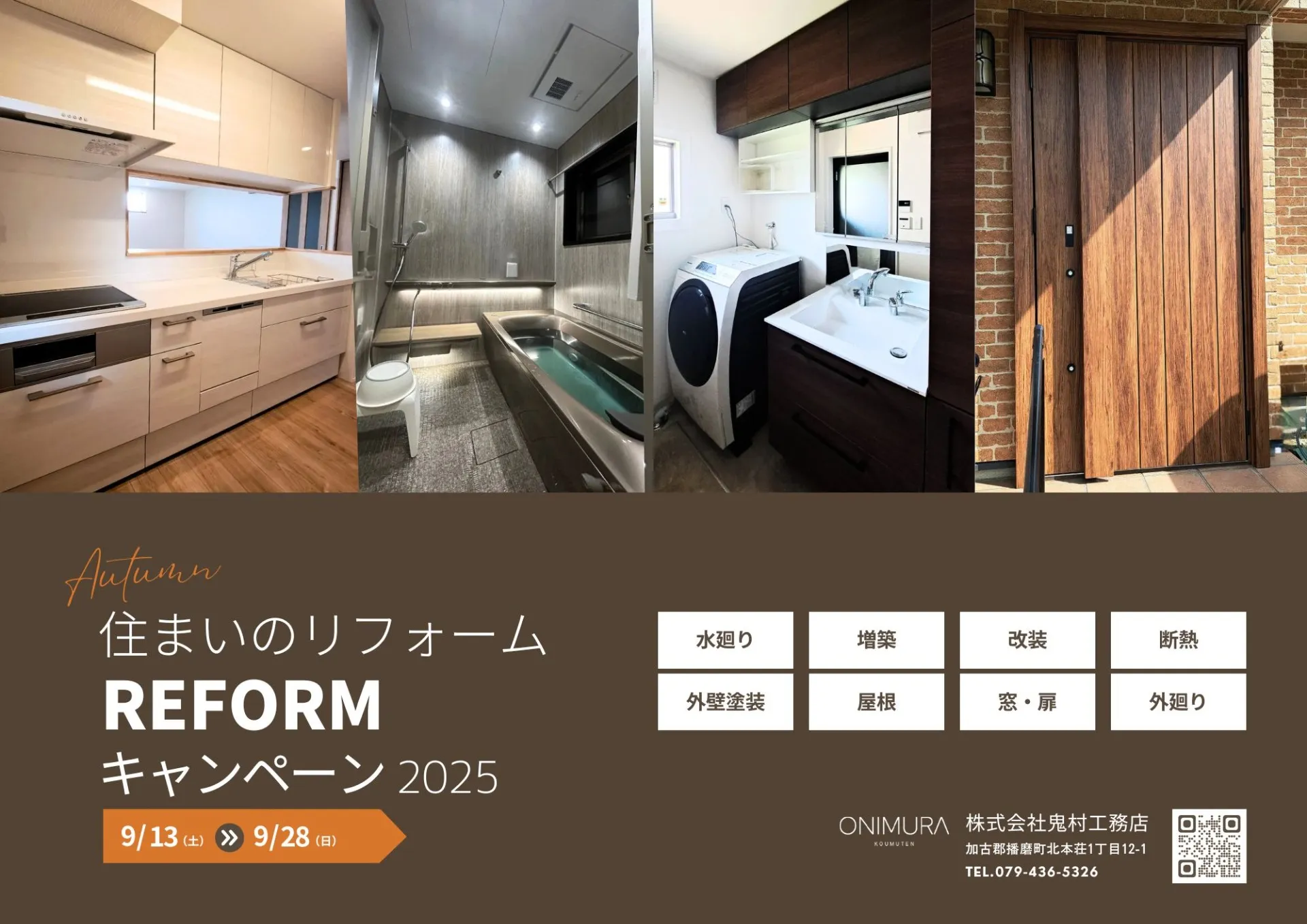 秋の住まいのリフォームキャンペーン開催 2025/09/05 住まいのリフォームキャンペーン 9月13日(金)~28日(土)の期間限定で、秋のリフォームキャンペーンを実施いたします。 キッチン・お風呂・トイレなど水まわりの入替えから、断熱窓や玄関ドアの交換、省エネ・快適性を高める工事まで 幅広くご提案。お住まいの「気になる」を解決するチャンスです。お見積り・ご相談は無料。 この機会にぜひお気軽にお問合せください。